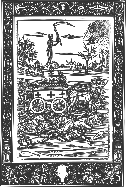 This features a black and white illustration of a man holding a scythe, standing on top of a carriage pulled by several horses. The scene is set in an open area with trees in the background. There are multiple people present in the picture, some of them lying down or sitting near the carriage. In addition to the main subject, there are various other elements that contribute to the overall composition of the image. A bird can be seen flying above the scene, adding a sense of motion and life to the illustration. The presence of horses and people in different positions creates depth and interest within the picture, making it an intriguing visual piece.