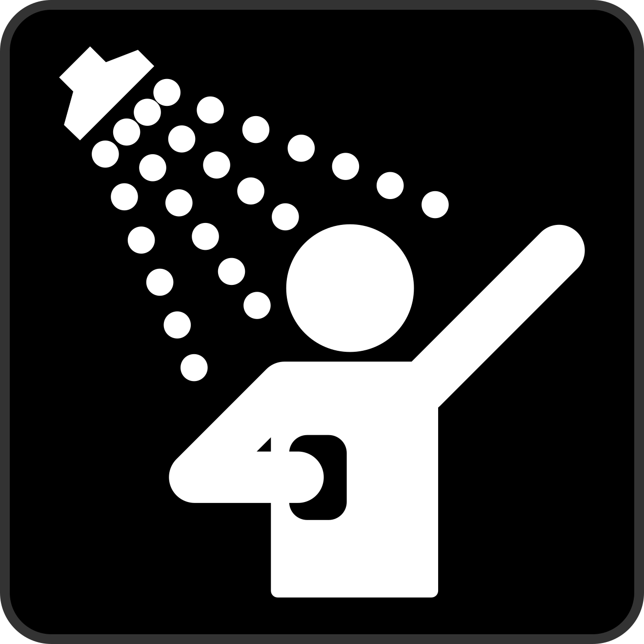 This features a black and white sign with an icon of a person holding a shower head. The person is positioned in the center of the sign, and the shower head is located above them. The sign appears to be a symbol for a shower or bathroom facility. The design of the sign is simple yet effective in conveying its intended message.