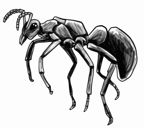 This features a black ant drawing, which is depicted from the side view. It has six legs, but it is only standing on two of them. The ant's body is quite large and occupies most of the frame. Its legs are spread out in various directions, giving the impression that it is ready to move or engage with its surroundings. This drawing captures the essence of an ant's unique appearance and structure, making it a fascinating visual representation of this insect species.