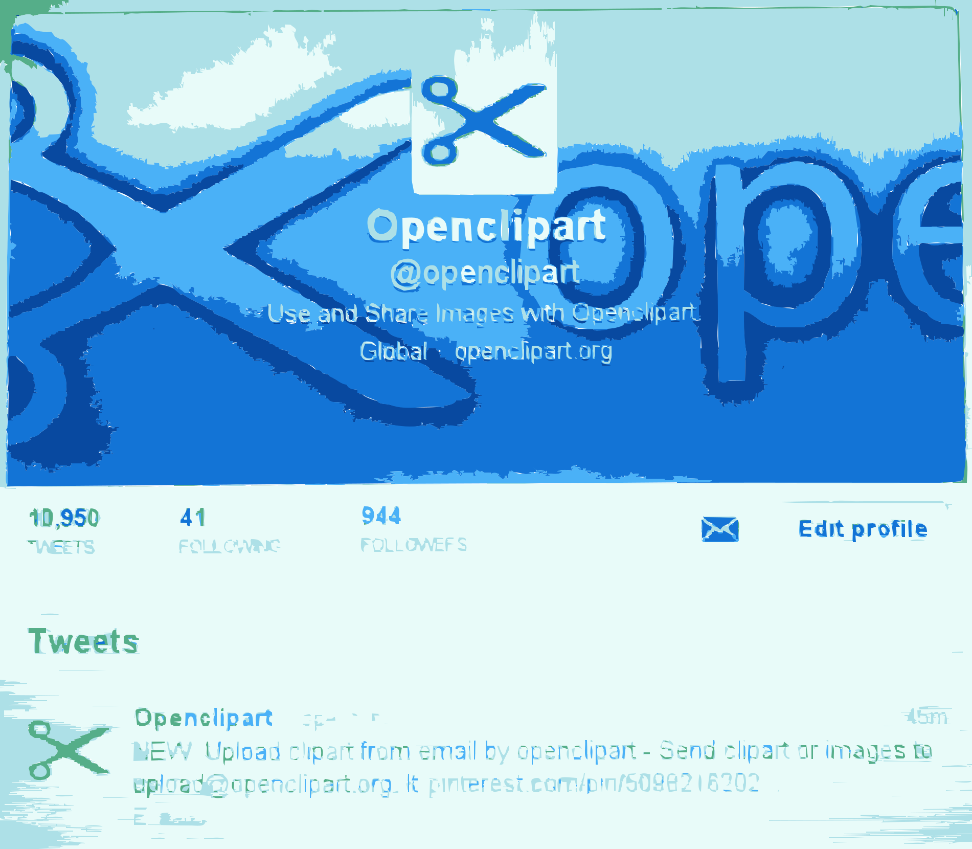 This is a screenshot of a Twitter page featuring the profile of Openclipart. The profile has scissors as its cover and profile picture, along with several tweets displayed on the screen. There are only a few people being followed by the user, indicating that they have limited connections on this platform. The overall appearance of the image is somewhat blurry, giving it an artistic or distorted look.