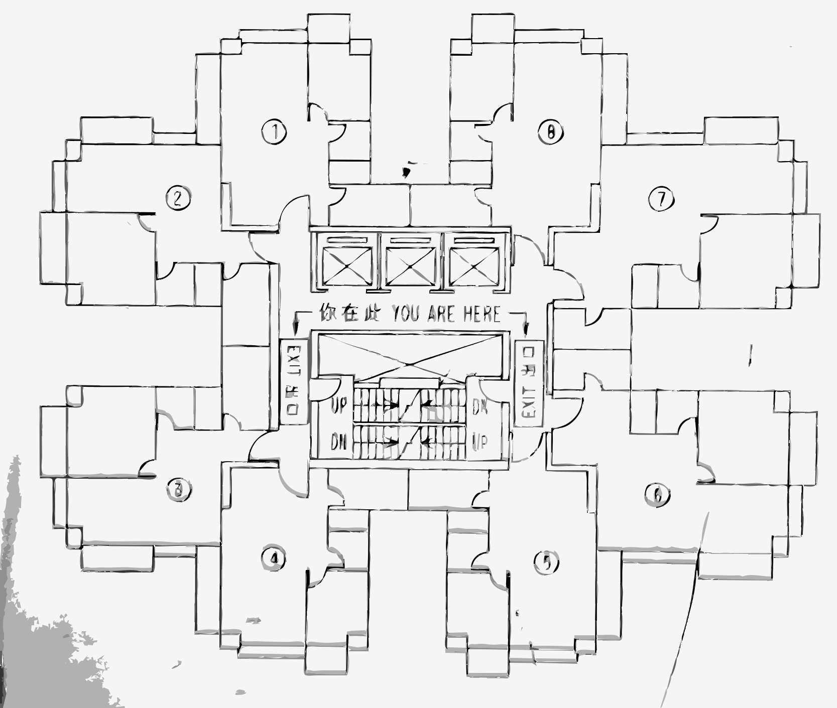 This features a large, intricate drawing of an old building with many rooms and hallways. It appears to be a blueprint or architectural sketch of the structure. The drawing is filled with various numbers and letters, possibly indicating measurements or specific details about each room. The overall design showcases the complexity and detail of the building's layout.