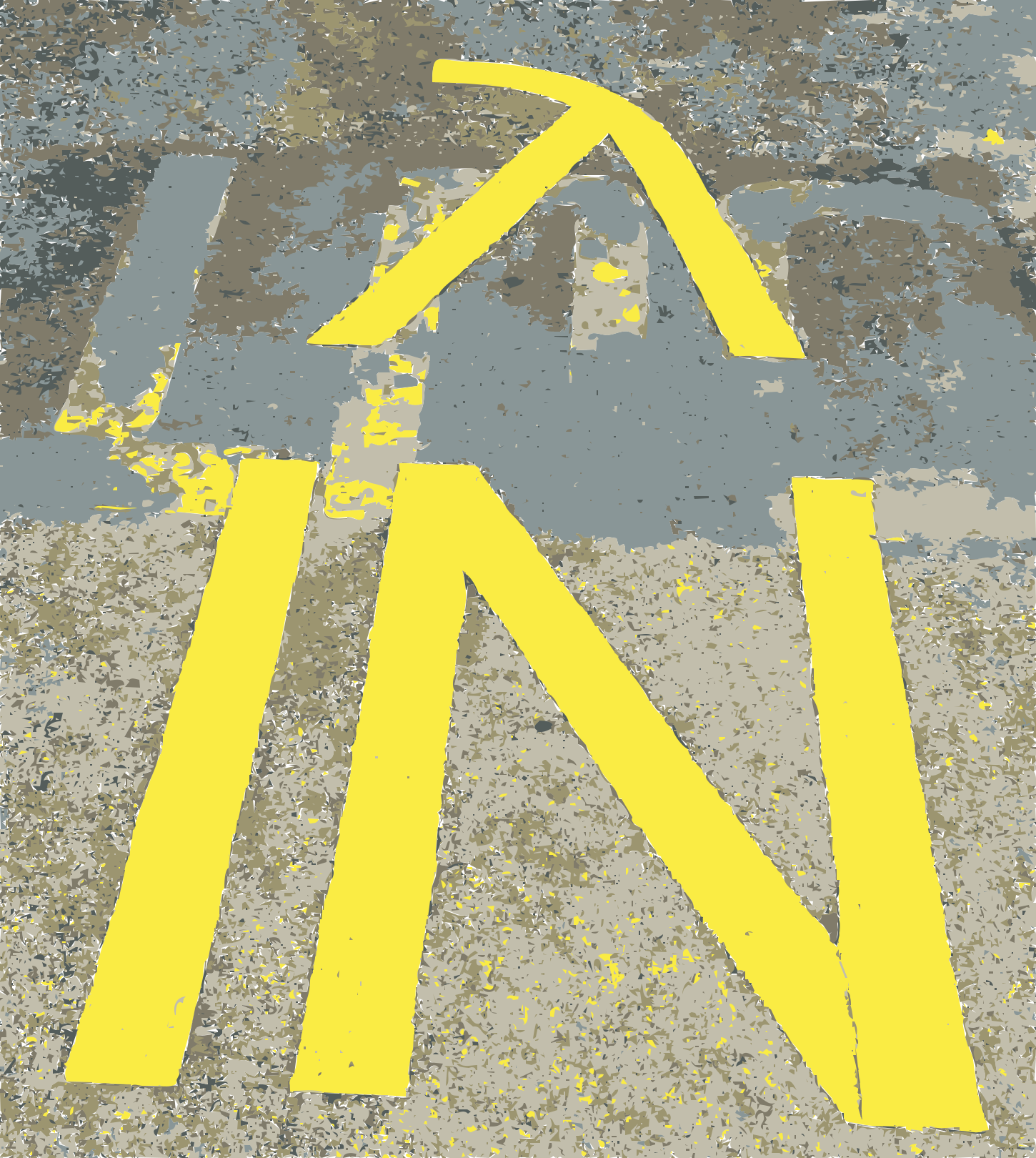 This features a yellow arrow pointing to the right, with the word "in" written below it. This sign is likely meant to guide people in the direction they need to go or indicate that they are currently inside an area. The arrow and the word together create a clear visual message for those passing by.