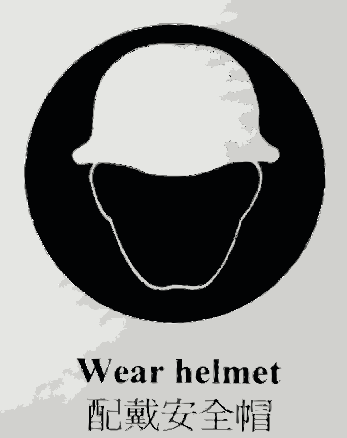 This features a black and white circle with the word "wear helmet" written in both English and Chinese. Inside the circle, there is an illustration of a person wearing a hat or helmet. This sign could be used to remind people to wear their helmets for safety purposes while riding bicycles or motorcycles. The combination of languages on the sign suggests that it may be intended for use in a multicultural environment, where both English and Chinese speakers are present.