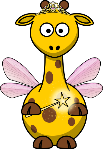 This features a unique and whimsical illustration of a giraffe, dressed up as a fairy. This creative portrayal gives the impression that the giraffe is wearing a crown and holding a wand, adding an element of fantasy to the scene. The giraffe's wings are spread out, giving it a more ethereal appearance. The combination of the giraffe's features with the fairy-like attire creates a delightful and imaginative visual that captures the viewer's attention.
