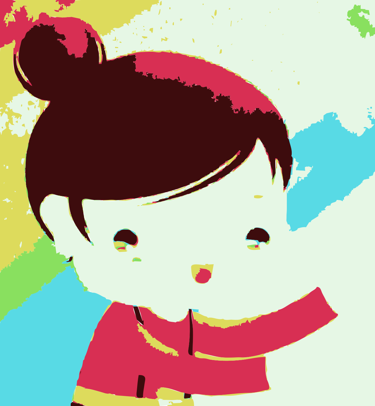 This features a colorful cartoon character with a red shirt and a ponytail. The character is holding its arm out, possibly waving or pointing at something. The character's facial expression appears to be somewhat sad or disinterested. The overall scene has a vibrant and lively atmosphere due to the use of multiple colors in the background.