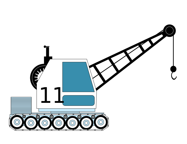 This features a large crane with a number 11 on it, sitting in the middle of a field. It is an illustration or drawing that showcases the crane's size and prominence. The crane has a hook at the end of its arm, which is hanging from the top of the image. This unique design makes the crane stand out as it sits in the open space.