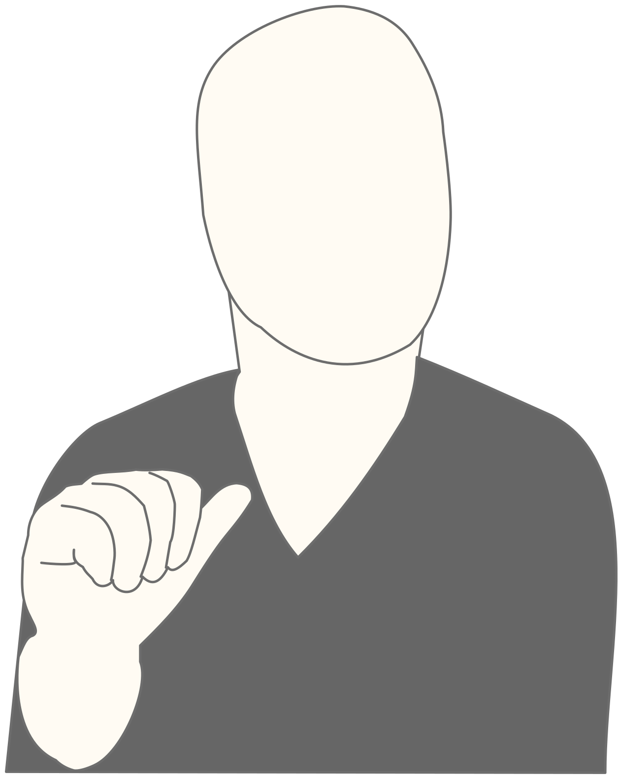 This features a person wearing a gray shirt, with their face obscured by a white background. They are pointing at something with their finger, indicating that they might be drawing attention to an object or concept in the scene. The figure is depicted as having a black outline, which adds depth and contrast to the overall image.