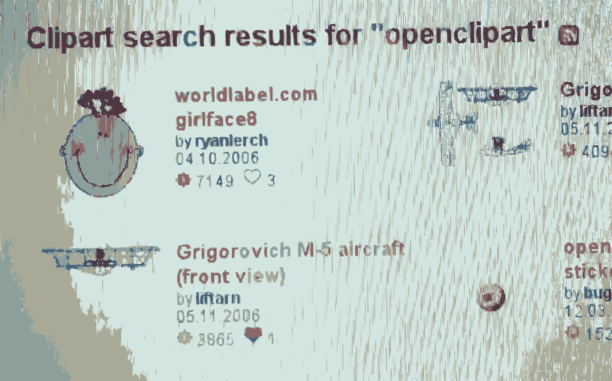 This is a screenshot of an openclipart.com search results page, featuring various images and descriptions. There are several pictures displayed on the screen, including one that reads "Girl Face" with a picture of a woman's face underneath it. Other images include a clock, a plane, and a car, among others. The search results are presented in a visually appealing manner, making it easy for users to find what they are looking for on the openclipart website.