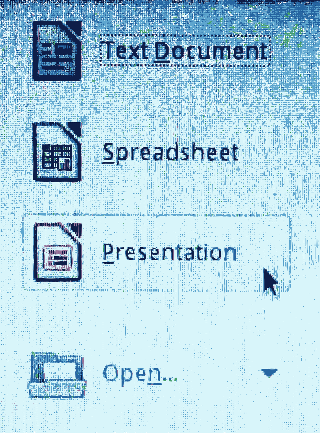 This is a screenshot of a computer screen with several icons displayed. These icons include a document, spreadsheet, presentation, and open. There are also two other icons that appear to be related to the main group of icons. A mouse pointer can be seen on the right side of the screen, indicating where the user's cursor is currently located. The overall appearance of the image suggests that it was taken from a computer desktop or similar environment.