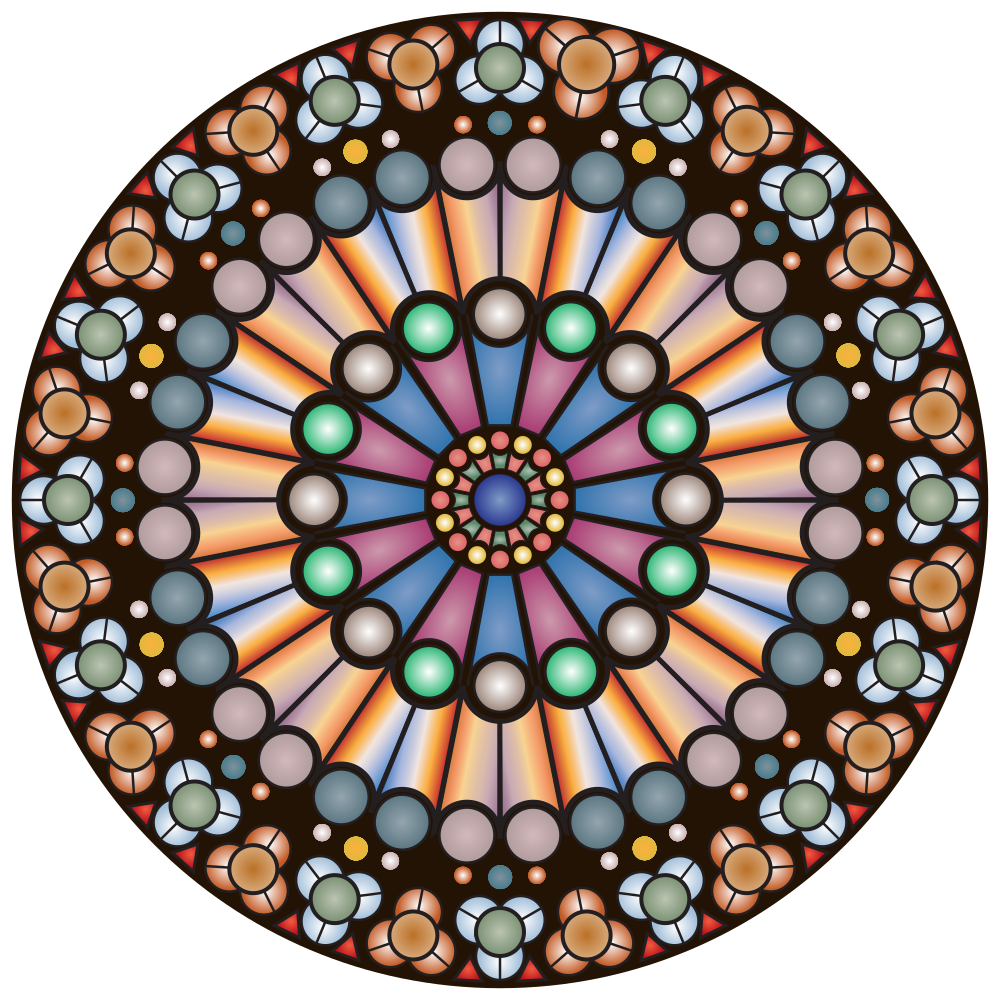 This features a large, colorful circular design that resembles a stained glass window. It is composed of various shapes and colors, including blue, green, yellow, orange, pink, purple, red, and white. The design appears to be intricate and detailed, with many small circles and dots arranged throughout the pattern. This artistic piece could potentially serve as a decorative element or an interesting conversation starter for those who appreciate its unique appearance.