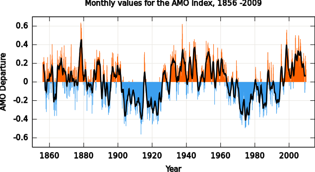 This displays a graph showing the monthly values for the AMO index from 1856 to 2009. The AMO index is an indicator of Atlantic Ocean temperature and salinity, which can influence weather patterns. The graph shows that the values have been steadily increasing over time, with some notable spikes in the late 19th century and early 20th century. This suggests that there may be a connection between the AMO index and historical weather events during those periods. Overall, the image provides valuable information about the trends of the AMO index and its potential impact on climate patterns.