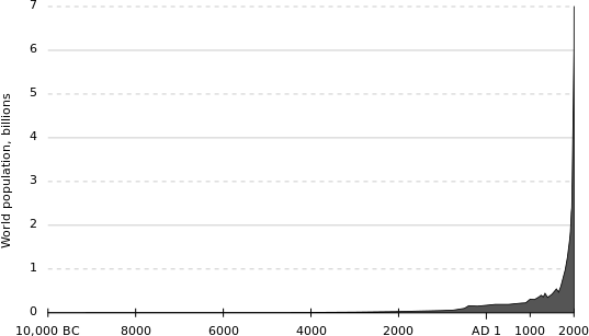 This displays a graph showing the population of the world over time. It is a line graph that starts at 10,000 BC and continues to the present day. The graph shows an exponential increase in population from the beginning to the current date. This illustrates how human populations have grown significantly throughout history, highlighting the importance of sustainable living practices and resource management.