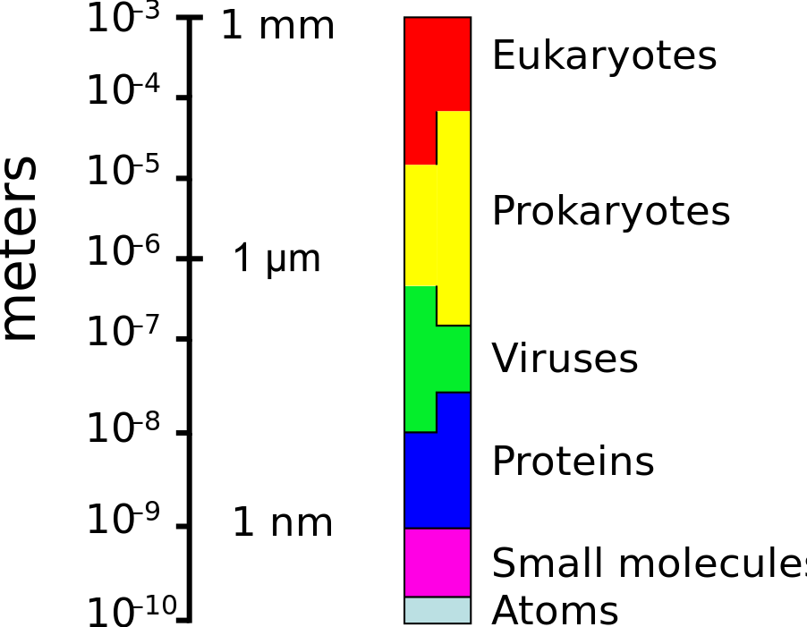This displays a colorful chart with various scientific terms and measurements. At the top of the chart, there is a ruler that measures in millimeters. Below the ruler, there are several different colored bars representing different scientific concepts. These include proteins, viruses, eukaryotes, prokaryotes, small molecules, atoms, and finally, archaea. The chart appears to be an educational tool for understanding these scientific terms and their relationships with each other.