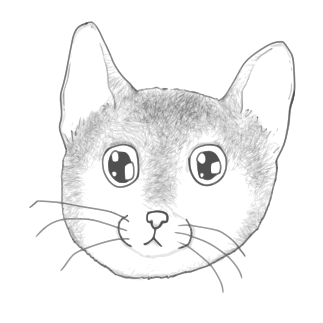 This features a cute, cartoon-like drawing of a cat's face. The cat has large eyes and a small nose, giving it an adorable appearance. The drawing is done in black and white, with the cat's fur depicted as gray. The cat's whiskers are also visible, adding to its distinctive features. Overall, this image captures the essence of a cute kitten face, making it an appealing visual for anyone who loves cats or enjoys cartoons.