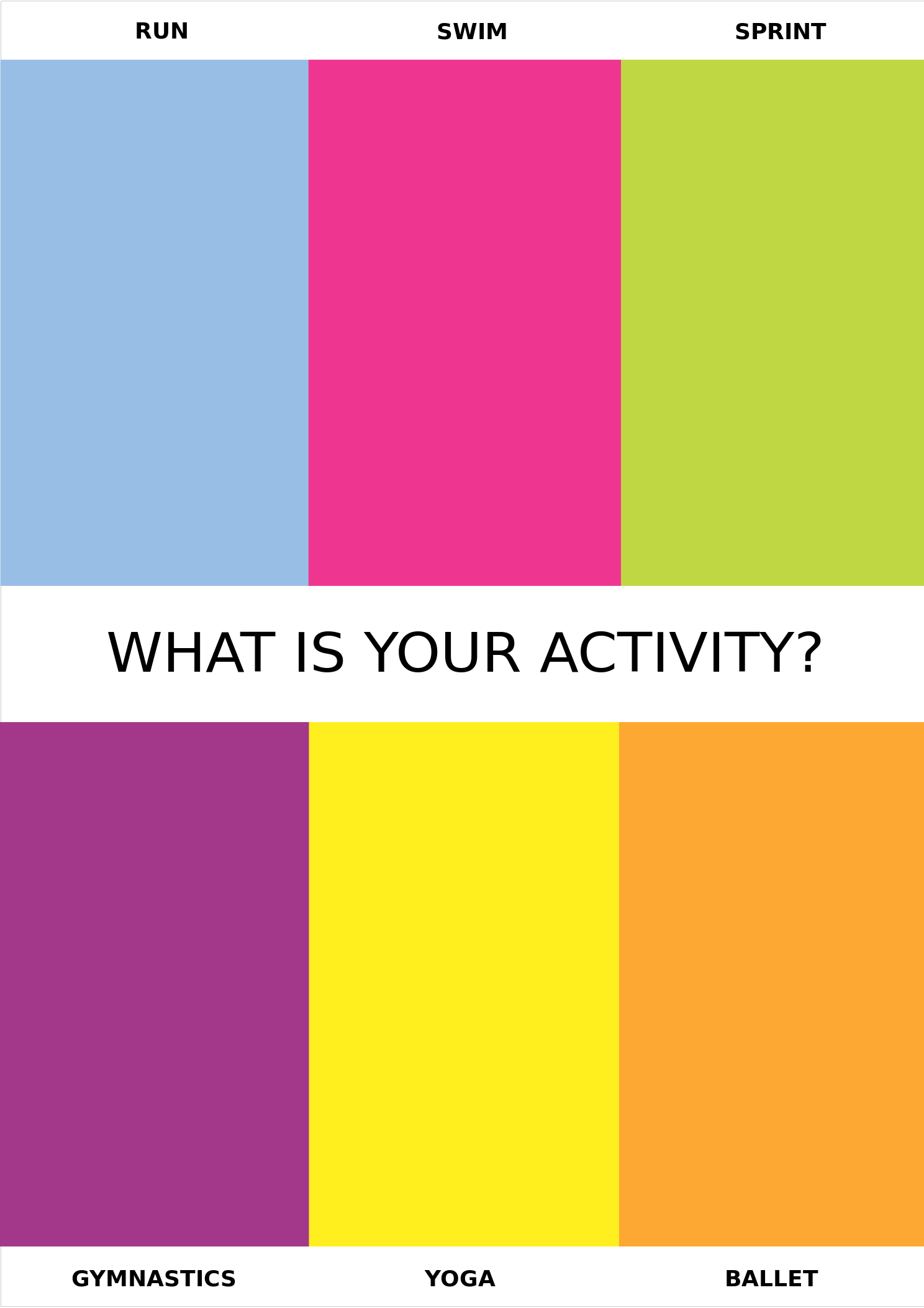 This features a colorful poster with four different colored sections, each representing an activity. These activities include swimming, sprinting, yoga, and running. Each section is labeled with the corresponding activity name in white text. The poster appears to be promoting physical fitness and encourages people to engage in these various sports or exercises. The vibrant colors of the poster make it visually appealing and inviting for potential participants.