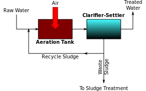 This depicts a diagram of an activated sludge process, which is a type of wastewater treatment. In the image, there are several boxes and arrows that illustrate the different stages of this process. A large red box with a red arrow pointing to it reads "Aeration Tank," indicating where oxygen is added to the water. Another smaller blue box with a blue arrow pointing to it reads "Clearifier-Settler," which helps remove suspended solids from the water. The image also shows a recycling process, as indicated by the arrows connecting different boxes and labels such as "Recycle" and "Sludge." Overall, this diagram provides an overview of the activated sludge wastewater treatment process.