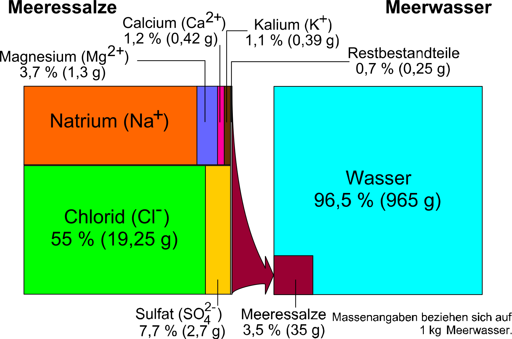 This displays a chart with various chemicals and their corresponding percentages. There are several elements, including sodium, potassium, calcium, chlorine, magnesium, and water. Each element is represented by a colored rectangle, making it easy to identify the different components of seawater. The chart shows that water makes up 96.57% of seawater, while sodium, potassium, calcium, chlorine, magnesium, and other elements make up the remaining percentage. The chart is organized in a way that allows for easy comparison between different elements, making it an informative visual representation of the composition of seawater.