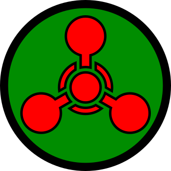 This features a green and red circle with an emblem in the center. This emblem is a representation of a molecule, specifically a chemical compound known as ethylene oxide. Ethylene oxide is a colorless gas that is used for sterilization purposes in medical settings. The green and red colors of the emblem are often associated with warning signs or cautionary symbols, indicating potential hazards related to this substance.