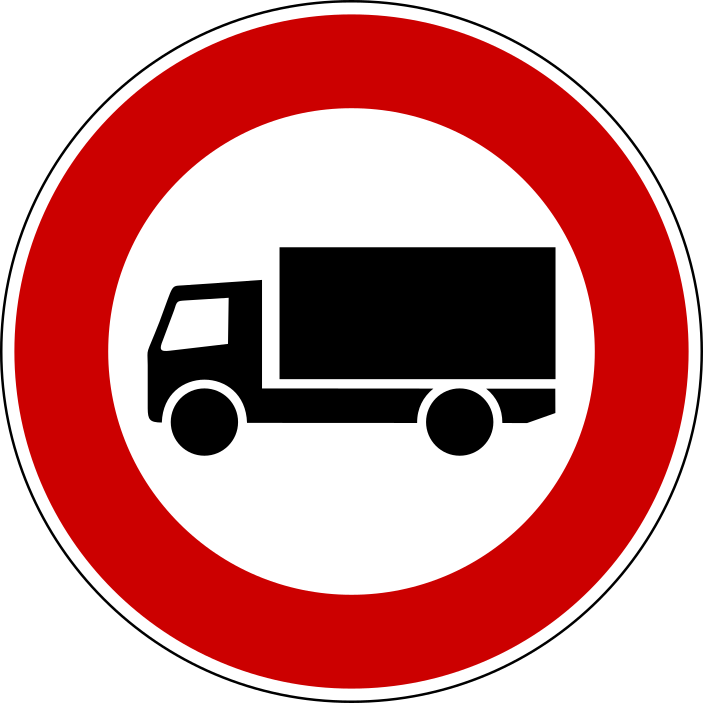 This features a red and white sign with an illustration of a truck driving down the road. The truck is positioned in the center of the sign, occupying most of its space. The sign appears to be a warning or caution for drivers about the presence of large vehicles on the road. The design of the sign is simple and easy to understand, making it an effective way to communicate important information to motorists.