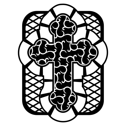 This features a black and white cross design, which is an intricate pattern of interconnected circles. This artistic representation of the cross has a unique and eye-catching appearance. The cross is surrounded by a decorative border that adds to its visual appeal. Overall, this design showcases creativity and attention to detail in its presentation.
