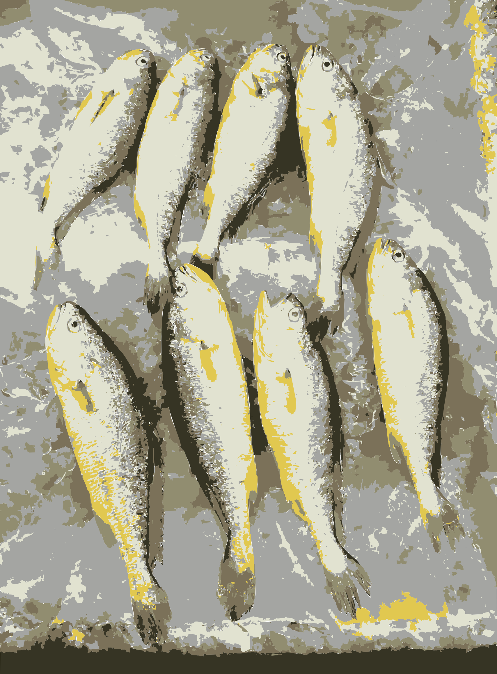 This features a table with several fish laid out on it. There are nine fish in total, all of which appear to be yellow and white in color. They are arranged in various positions across the table, some closer together while others are more spread out. This display of fish suggests that they may have been prepared for cooking or serving as a meal. The scene conveys a sense of abundance and freshness, with the vibrant colors of the fish drawing attention to their natural beauty.