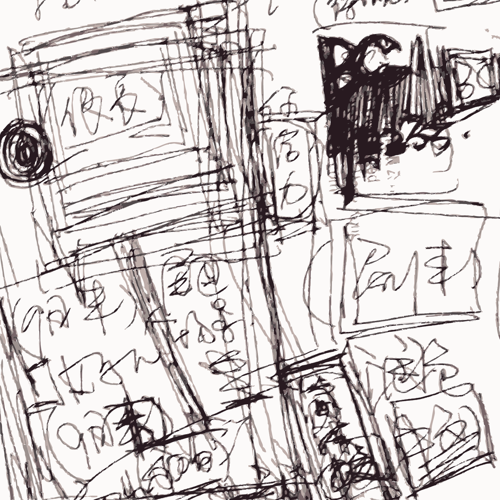 This is a black and white drawing of various objects, including books, cards, and other items. There are several books scattered throughout the scene, with some placed horizontally and others vertically. A few books can be seen in the top left corner, while others are located towards the bottom right side of the image. In addition to the books, there is a clock positioned near the top left corner of the drawing. The overall composition of the scene appears to be a mix of doodles and thoughtful sketches, creating an interesting visual experience for the viewer.