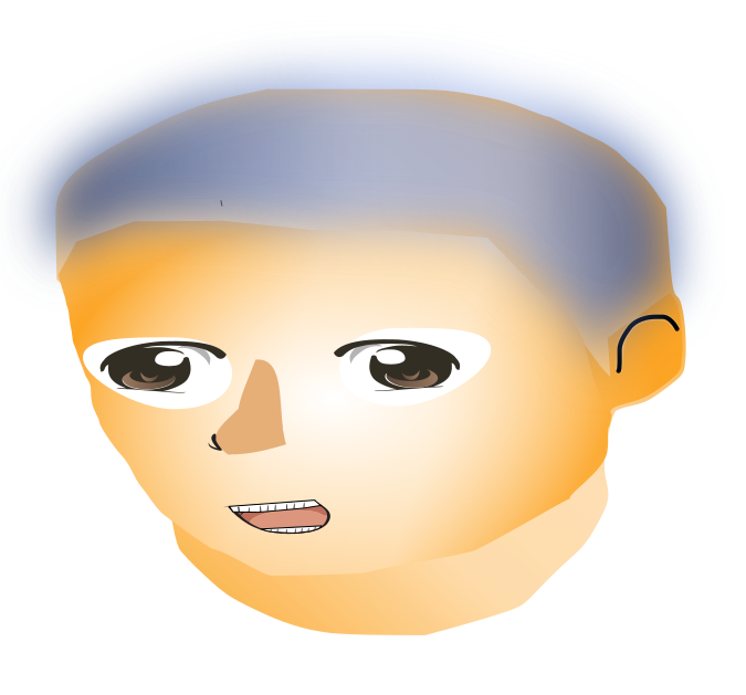 This features a cartoon-like face with blue hair, giving it an anime appearance. The face is smiling and has large eyes, which adds to the overall cuteness of the character. The facial expression appears friendly and inviting, making it a pleasant sight for viewers. The color scheme of the image includes shades of orange and blue, further enhancing the cartoon-like quality of the face. Overall, this is an adorable and cheerful representation of a person's head with a unique twist on their appearance.