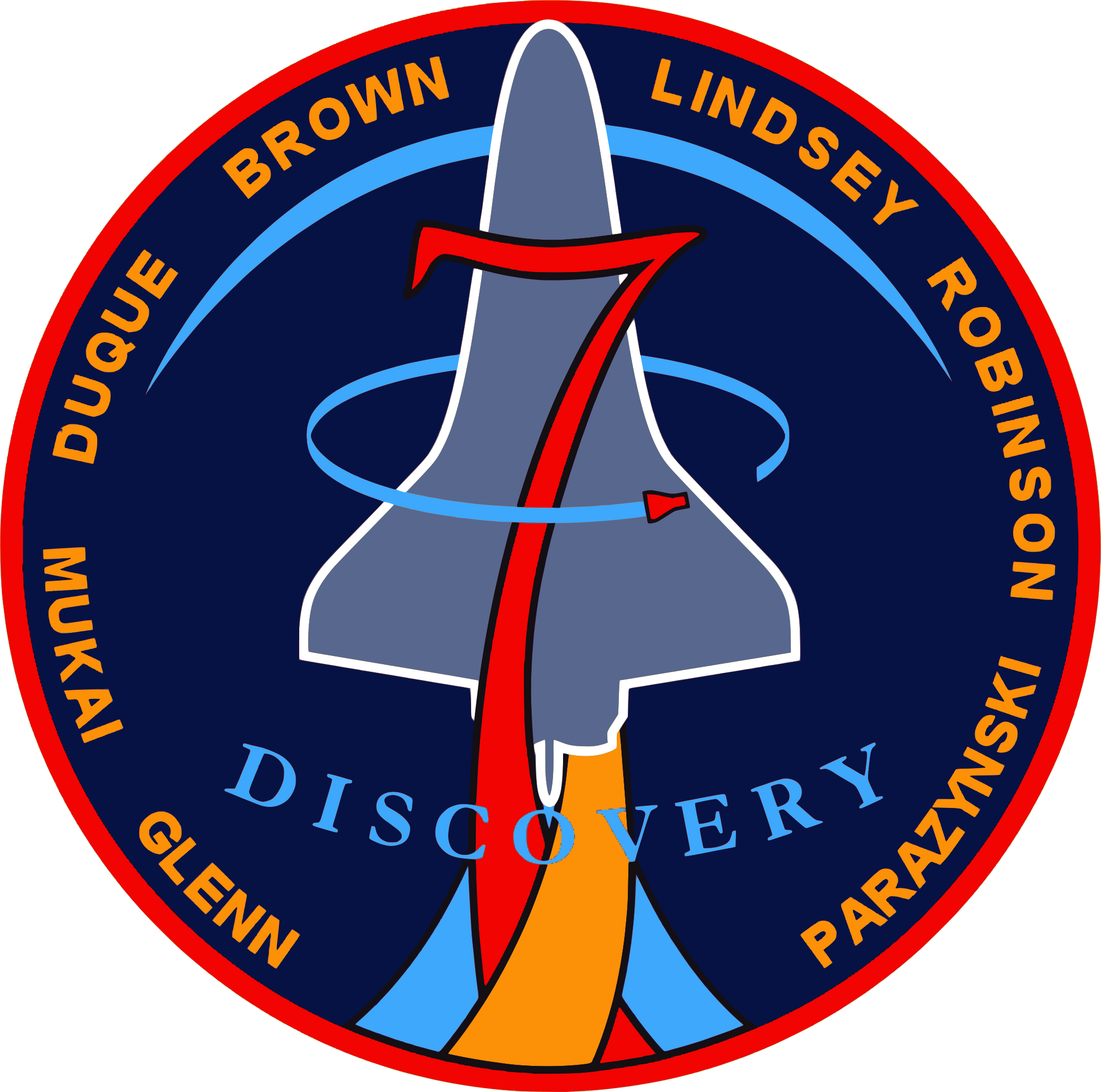 This features a round, blue and orange space shuttle patch with the words "Discovery" written in white. The patch is adorned with an illustration of a rocket ship, which appears to be the focal point of the design. The patch also includes the names of several individuals who were involved in the mission, including Brown, Lindsey, and Robinson. These names are displayed around the outer edge of the patch, adding more detail and context to the overall design.