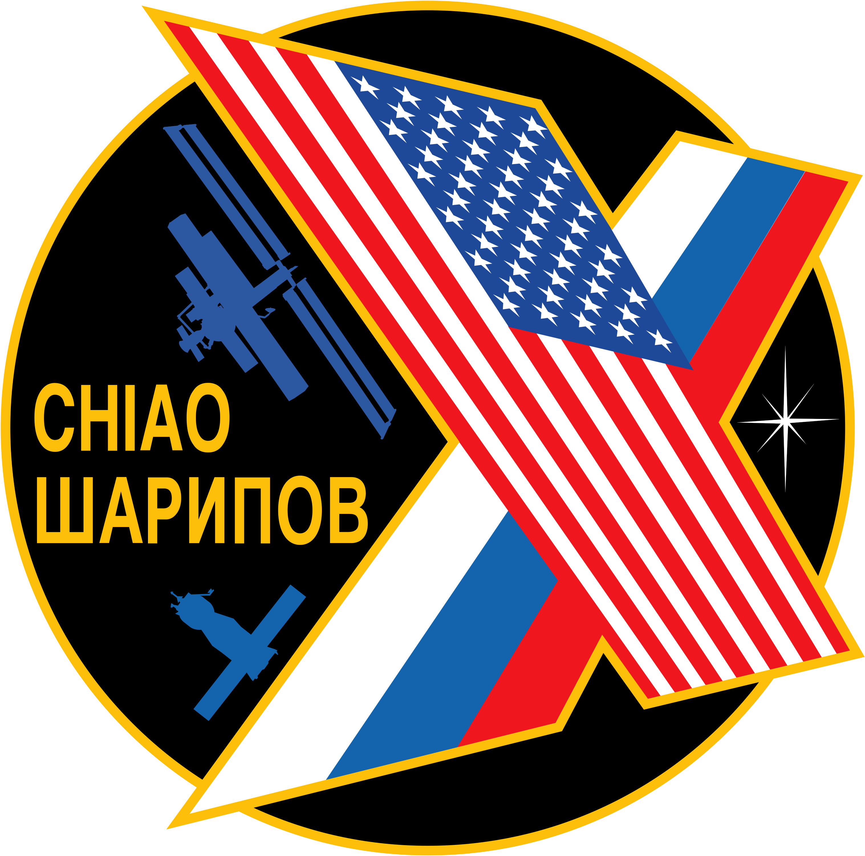 This features a round, colorful logo with an American flag and Russian flag. The flag of the United States is positioned on top of the flag of Russia, creating a unique blend of two nations' symbols. The design also includes a space shuttle, which adds to the overall theme of the logo. This combination of elements suggests that the logo might be associated with an international collaboration or partnership between the two countries in the field of space exploration or technology.
