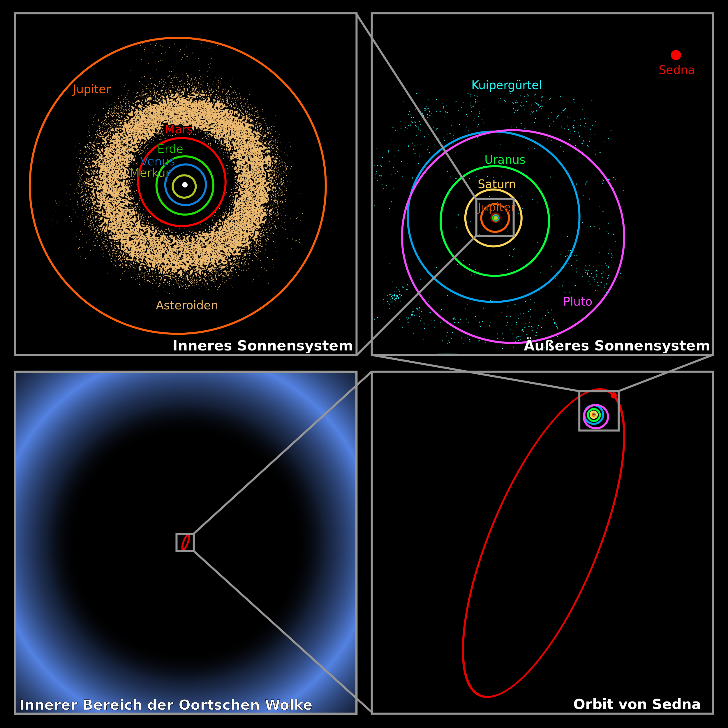 This is a collection of four diagrams, each depicting different aspects of the solar system. The first diagram shows the inner planets Mercury and Venus in close proximity to Earth. The second diagram displays the outer planets Jupiter and Saturn, with their respective moons visible as well. The third diagram focuses on the Oort Cloud, a region of icy objects that extend beyond the Kuiper Belt. Finally, the fourth diagram illustrates Sedna's orbit around the Sun, highlighting its unique position in the solar system. Each diagram is labeled with text describing the specific celestial bodies and their positions within the solar system.