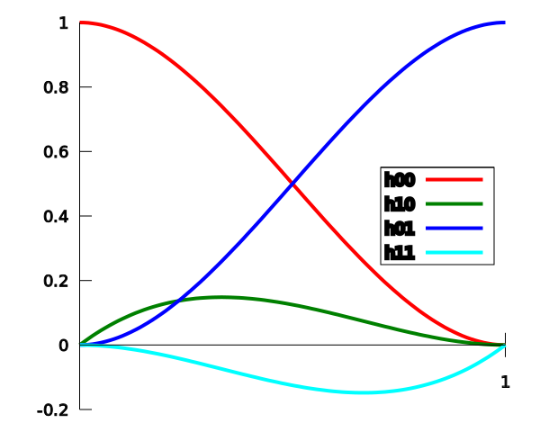 This displays a graph with three different colored lines, each representing a specific value. The first line is blue and appears to be on the left side of the graph, while the second line is red and located in the middle section. The third line is green and situated towards the right side of the graph. These lines are likely part of an equation or mathematical representation, possibly related to Hermite basis functions. The image also features a numbered scale on the left side, with numbers ranging from 0 to 10. This scale may be used for reference when interpreting the values represented by the colored lines in the graph. Overall, the image presents an intriguing visual representation of mathematical concepts and their relationships.