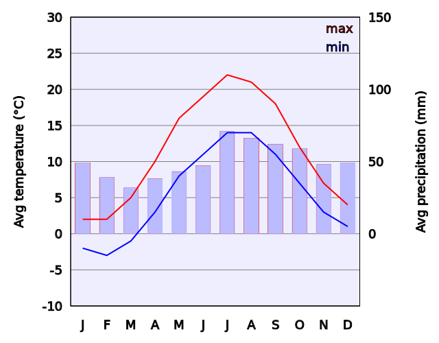 This displays a graph showing the temperature in Copenhagen over time. The graph is divided into two sections, one for maximum and minimum temperatures and another for average precipitation. The maximum temperature line shows that the highest temperature recorded was 10 degrees Celsius on January 27th. On the other hand, the lowest temperature recorded was -5 degrees Celsius on December 3rd. The average precipitation line indicates that the most rainfall occurred in July with a total of 14 millimeters. The least amount of rainfall was observed in January with only 2 millimeters. This chart provides valuable information about the climate and weather patterns in Copenhagen, which can be useful for residents and visitors planning their activities accordingly.