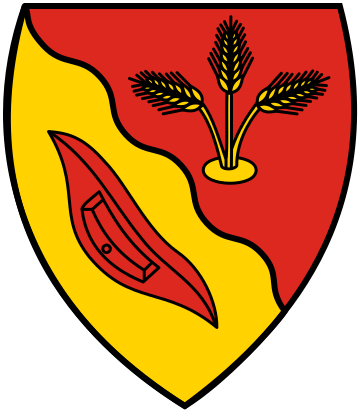 This features a coat of arms with a shield design, showcasing an open book and a boat. The shield is adorned with wheat stalks, giving it a unique appearance. The colors used in the coat of arms are red and yellow, creating a striking contrast against each other. This emblem could be associated with a specific organization or institution, as it represents a combination of elements that convey meaning and identity.