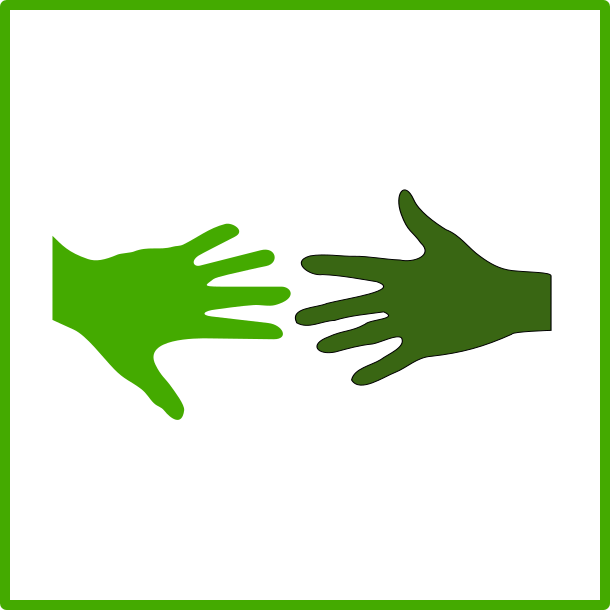 This features a green hand reaching out towards another hand, creating an iconic symbol of connection and unity. This symbol is often used to represent environmental or ecological themes, as the color green is commonly associated with nature and sustainability. The hands are depicted in a simple yet powerful manner, emphasizing their importance in conveying the message they intend to convey.