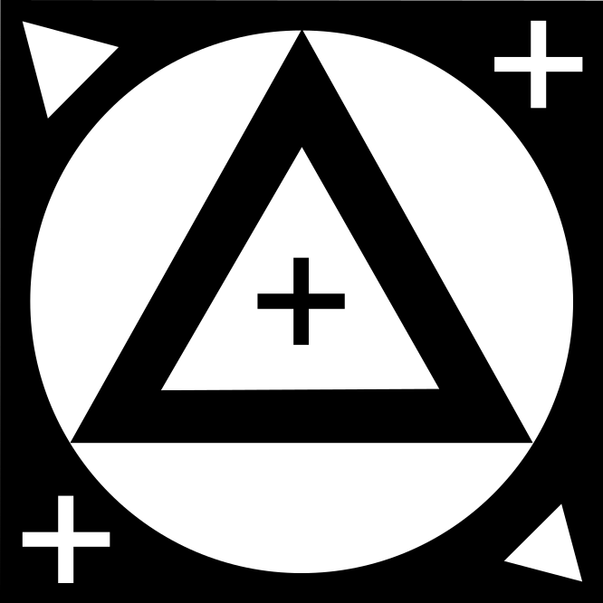 This features a black and white circle with a triangle in the middle. This triangle is surrounded by a white circle, which itself is contained within a larger black square. In each corner of the square, there are two small triangles and an "add" sign. The overall design gives off a modern and minimalist vibe.