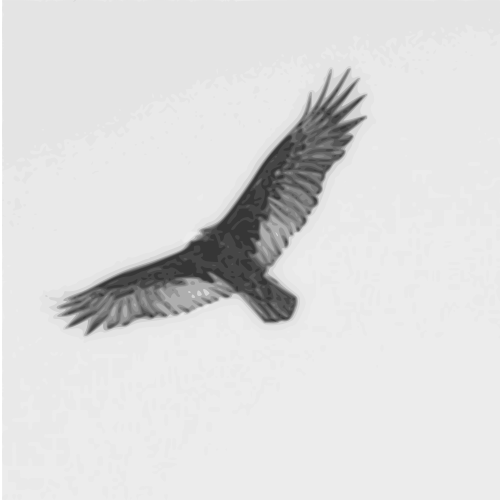 This features a black and white photograph of a turkey vulture flying in the sky. It appears to be captured during daytime, as there is no indication of any clouds or other weather elements. The bird's wings are spread out, showcasing its impressive size and flight capabilities. The photo has been converted into a bitmap and then traced with Inkscape, which gives it an artistic touch while maintaining the vulture's natural appearance.