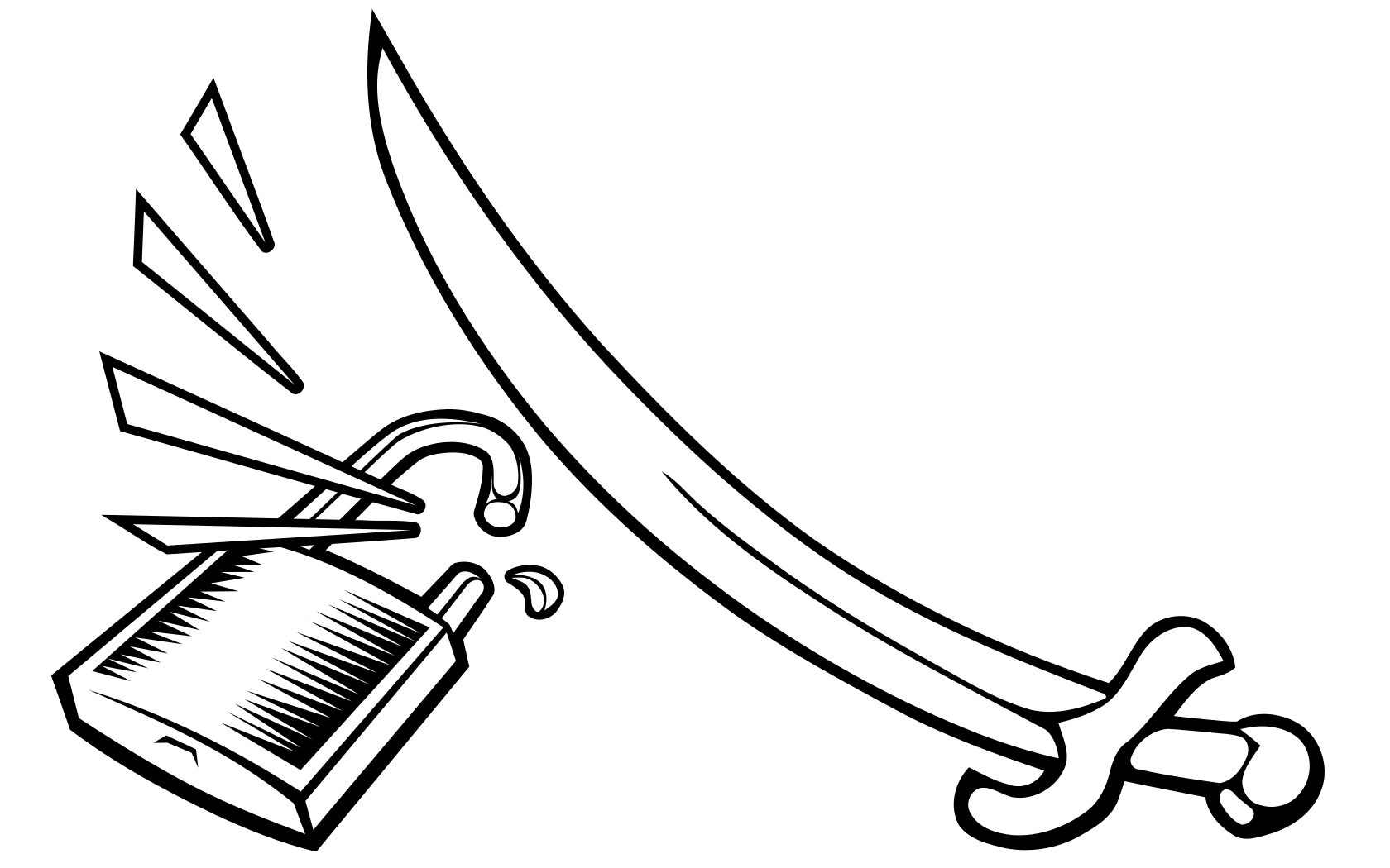 This features a black and white drawing of a sword breaking through a lock. The sword is positioned on the left side of the image, while the lock is located towards the center. A key can be seen in the middle of the scene, possibly representing the key to unlock the door or open the lock. This artistic representation captures the essence of a sword breaking through a barrier and highlights the strength and power associated with such an action.