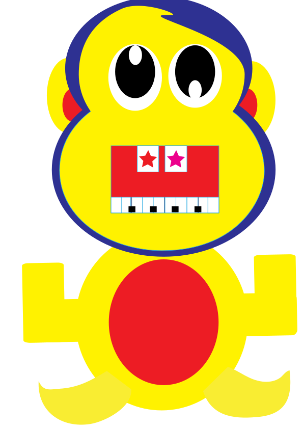 This features a colorful cartoon monkey with a red and yellow design. It has a big smile on its face, giving the impression of being happy or playful. The monkey's mouth is open, revealing teeth that are also painted in bright colors. This fun character appears to be the main focus of the image, capturing attention with its cheerful expression.