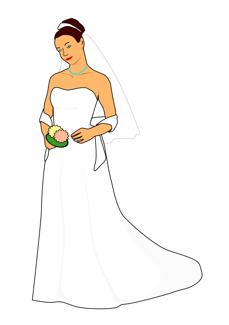 This features a beautifully drawn illustration of a woman wearing a white wedding gown with a veil on her head. She is holding a bouquet of flowers in her hand, which adds to the elegance and charm of the scene. The woman's attire suggests that she might be getting ready for her wedding day or has just finished one. The illustration captures the essence of a special occasion with its attention to detail and artistic representation of the bride-to-be.