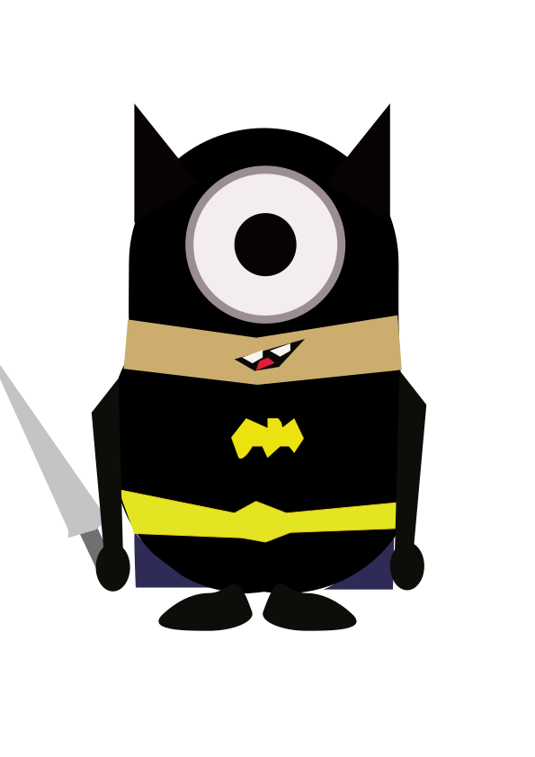 This features a unique and creative design of a Minion character dressed in a Batman costume. This whimsical combination gives the impression that the Minion is wearing a Batman suit, complete with a cape and mask. The Minion's facial expression appears to be somewhat angry or displeased, adding an element of humor to the scene. In addition to the main character, there is also a knife visible in the image, which further adds to the playful nature of the scene. Overall, this image showcases a fun and imaginative take on popular characters from different franchises.