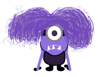 This features a purple cartoon character with a single eye and three white teeth. This unique character is wearing a black outfit, giving it an interesting appearance. It appears to be sitting down in the scene, possibly posing for a picture or simply enjoying its time. The character's hair seems to be quite messy, adding to its quirky charm. Overall, this illustration captures the essence of a purple minion with an eye and teeth, making it an interesting visual piece.