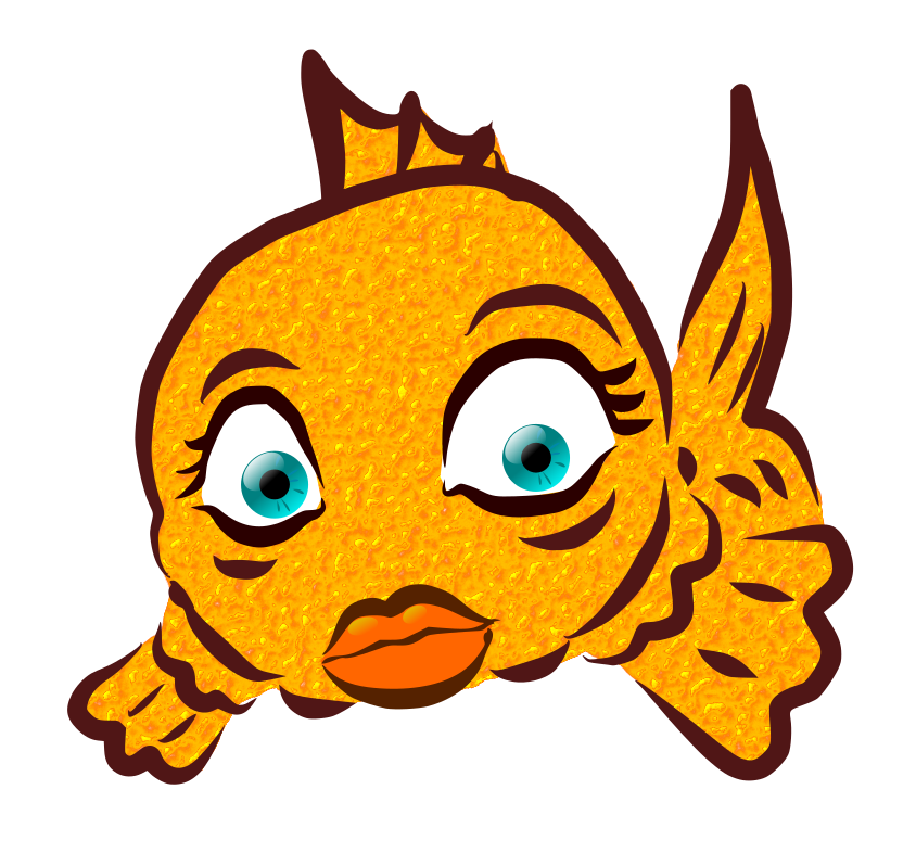 This features a cartoon fish with a yellow and orange color scheme, giving it an aquatic appearance. It has large blue eyes that are the focal point of its face, adding to its playful and whimsical look. The fish's lips are painted in a shade of plum, which contrasts nicely against the bright yellow skin. This unique design creates a visually appealing and engaging image that captures the viewer's attention.