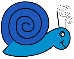 This features a cartoon drawing of a blue snail with a spiral shell that is dark blue and a light blue body. The snail has two spiral antenna, one on the left side and another on the right side. It appears to be smiling as it faces right. The snail's shell is winding around its body, giving it a unique appearance. This delightful cartoon character captures the essence of a snail in a playful manner.