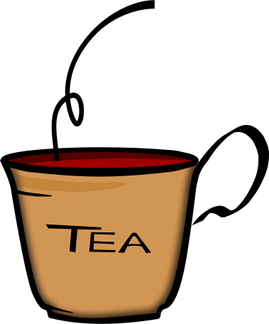 This features a cartoon-like cup of tea with the words "Tea" written on it. The cup is filled with a red liquid, which appears to be tea or coffee. A spoon can be seen inside the cup, ready for use. The overall scene gives off a whimsical and playful vibe, as if it were drawn by a child.