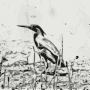 This features a black and white photo of a bird, possibly a heron or egret, standing on the ground. It appears to be in a grassy area with some plants around it. The bird is positioned towards the left side of the frame, taking up most of the space from top to bottom. The scene has an artistic quality to it, as if it were drawn or painted rather than being a real photograph.