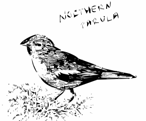 This features a black and white drawing of a small bird, specifically a Northern Parula. It is perched on top of some grass, giving the impression that it's standing in its natural habitat. The bird appears to be looking upwards, possibly observing something or someone above it. The drawing captures the essence of this beautiful and unique species, showcasing its distinctive features such as its black and white feathers and its small size.