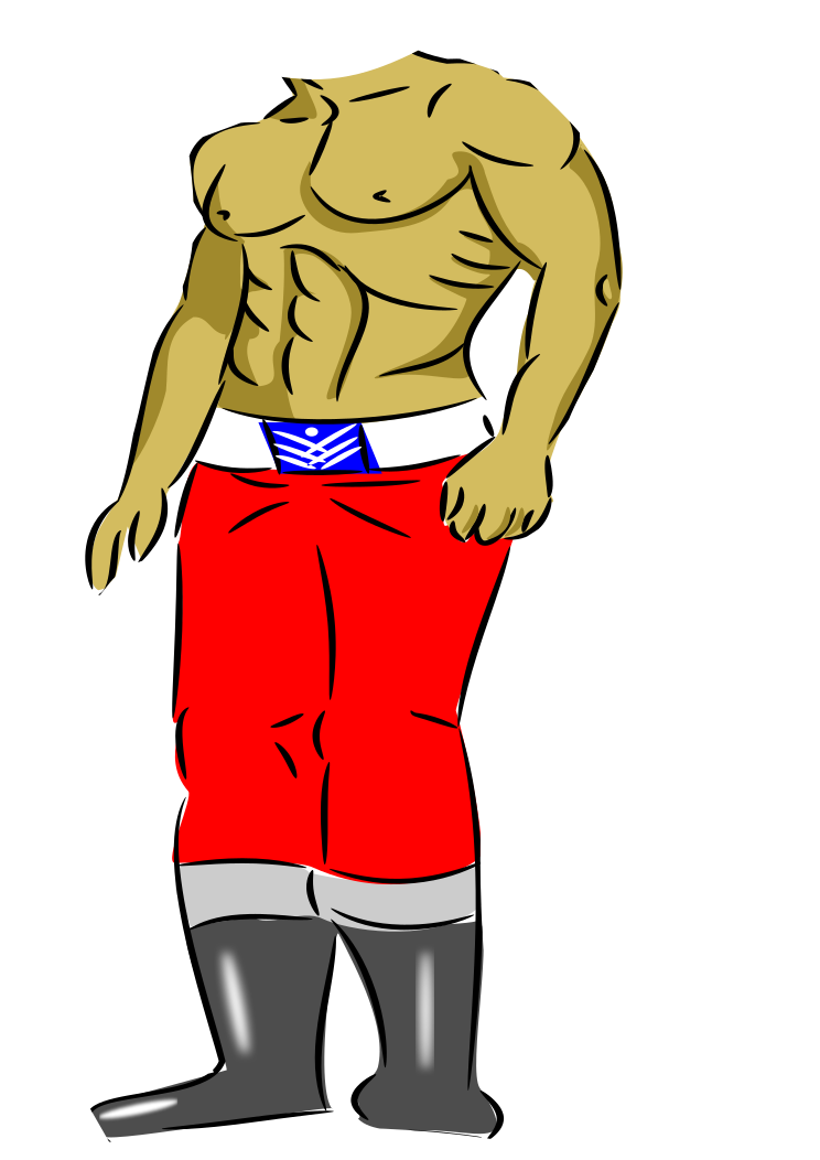 This features a cartoon drawing of a shirtless man wearing red pants. He is posing with his hands on his hips, giving the impression that he's flexing his muscles. The man appears to be quite muscular and well-built, showcasing his strength in the illustration.