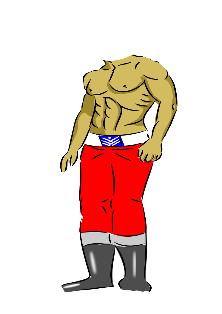 This features a cartoon drawing of a shirtless man wearing red pants and boots. He is posing with his hands on his hips, giving the impression that he's flexing his muscles. The color scheme of the drawing includes orange for the man's skin tone and red for his clothing. This unique character appears to be a mix between a bodybuilder and Santa Claus, as he is wearing a Santa hat on top of his head.