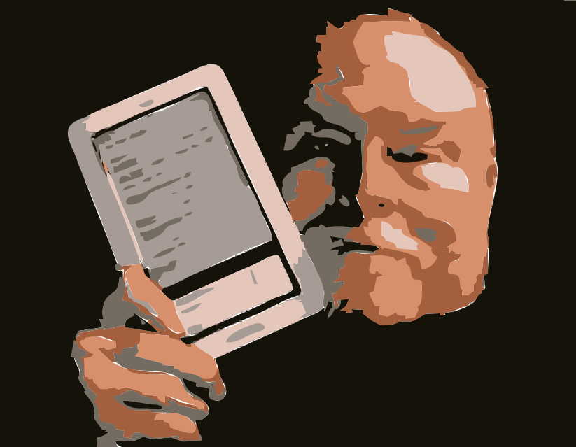 This features a man holding up an electronic device, possibly an e-reader or tablet. He is wearing glasses and has a beard, giving him a distinctive appearance. The man appears to be the main focus of the scene, with his face filling most of the frame. The electronic device he holds is positioned in front of him, occupying a significant portion of the image as well. Overall, it's an intriguing and engaging portrait that captures the essence of modern technology and its impact on our daily lives.