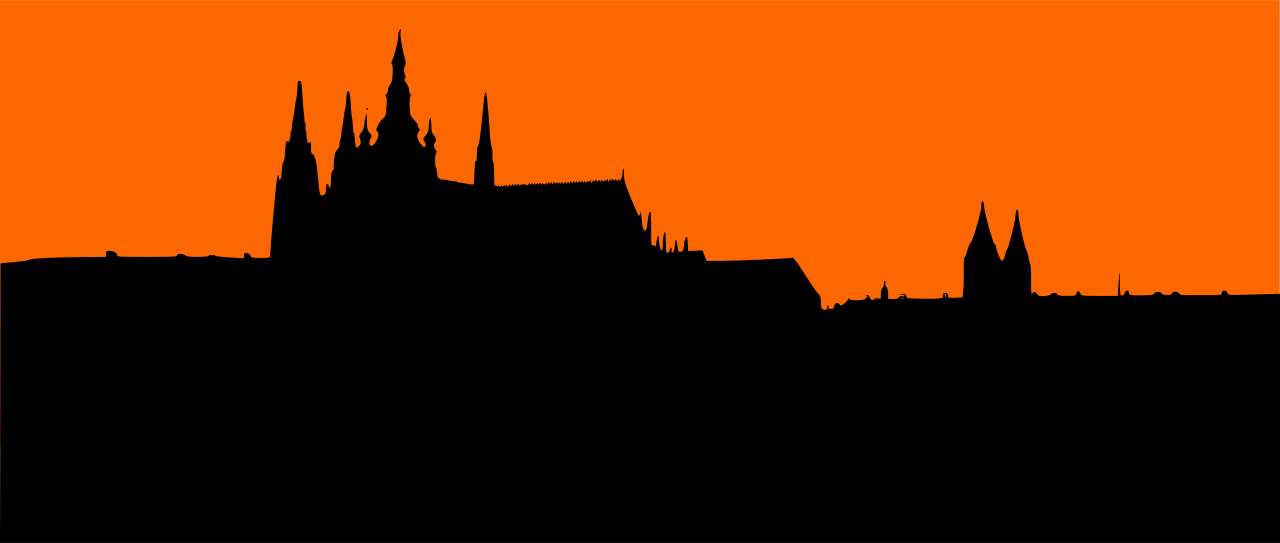 This features a silhouette of the Prague Castle, which is an iconic landmark in the city. The castle stands tall and majestic against the backdrop of the sky, creating a striking contrast between the dark outline of the building and the lighter hues of the sky. The silhouette showcases the architectural details of the castle, making it an impressive sight for viewers. This image captures the essence of the Prague Castle's beauty and historical significance in the cityscape.